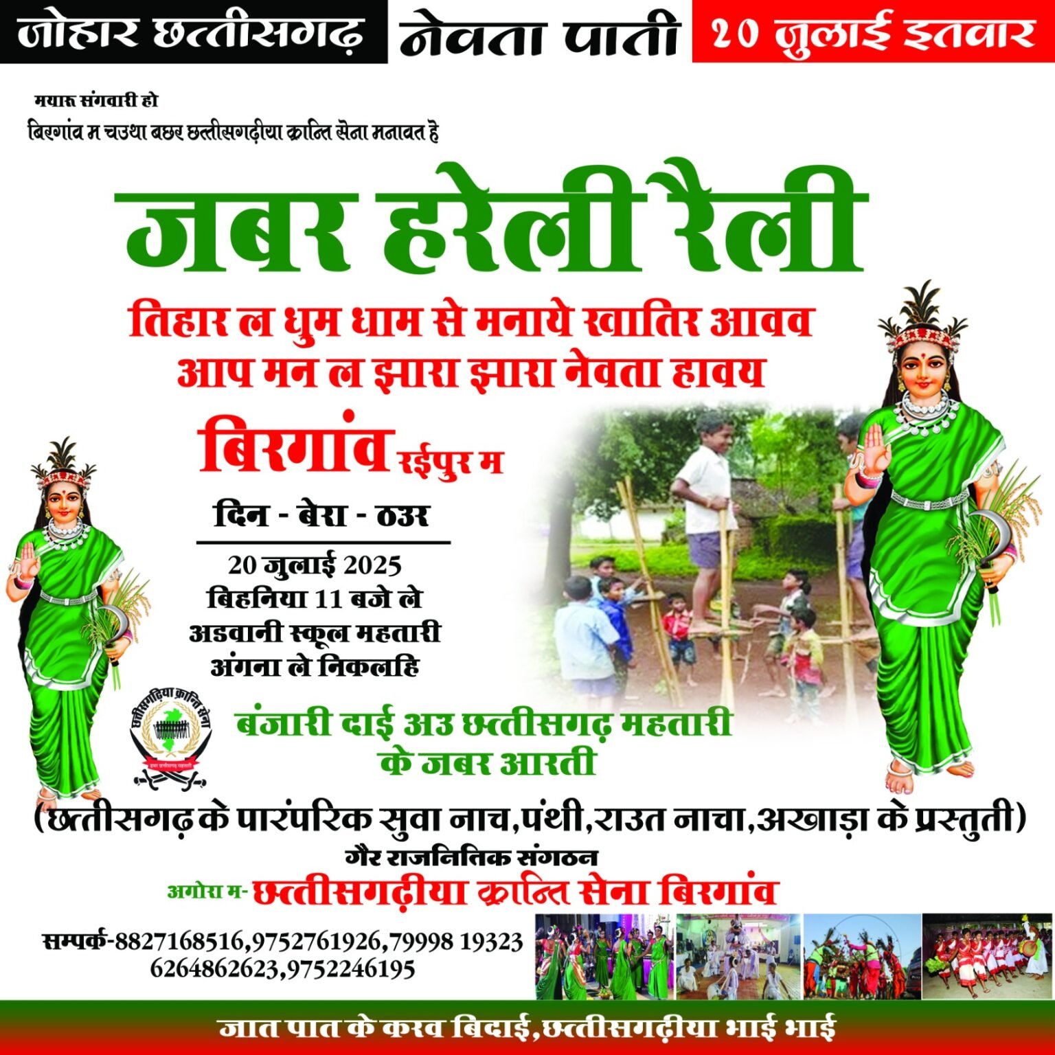 छत्तीसगढ़ के माटी, महतारी और मेहनतकश मनखे के आत्मा संग जुड़ल तिहार – हरेली के अवसर पर एक बार फिर से छत्तीसगढ़िया अस्मिता के रंग बिखरेंगे। छत्तीसगढ़िया क्रान्ति सेना (गैर-राजनीतिक संगठन) के बैनर तले शानदार सरलग चौथईया बछर के रूप में बिरगांव में जबरदस्त हरेली रैली आयोजित की जा रही है।