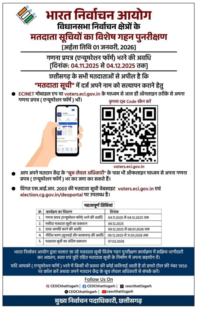 भारत निर्वाचन आयोग ने विधानसभा निर्वाचन क्षेत्रों की मतदाता सूचियों के विशेष गहन पुनरीक्षण (SIR) की प्रक्रिया प्रारंभ कर दी है। इस अभियान के अंतर्गत 04 नवंबर 2025 से 04 दिसंबर 2025 तक सभी मतदाताओं को अपना गणना प्रपत्र (Enumeration Form) भरना अनिवार्य किया गया है। यह अभियान देश के 12 राज्यों में एक साथ चलाया जा रहा है, जिनमें छत्तीसगढ़ भी शामिल है।