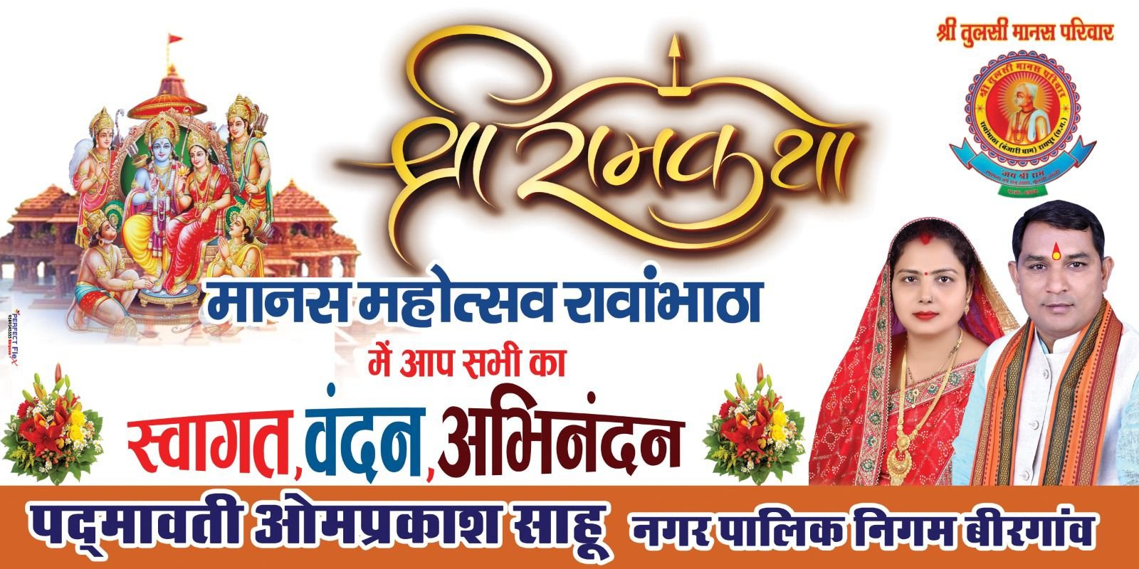 मानस महोत्सव रावांभाठा में नगर पालिक निगम बिरगांव से जुड़ीं श्रीमती पद्मावती ओमप्रकाश साहू के आगमन पर उनका स्वागत, वंदन एवं अभिनंदन किया जाएगा। आयोजन समिति द्वारा अतिथियों के सम्मान हेतु पुष्पगुच्छ, धार्मिक प्रतीकों एवं पारंपरिक स्वागत की विशेष व्यवस्था की गई है।