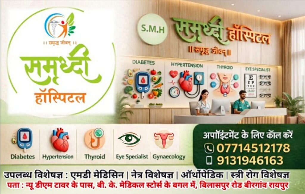 रायपुर।स्वास्थ्य के क्षेत्र में एक नई मिसाल कायम करते हुए समृद्धि हॉस्पिटल (S.M.H) अब रायपुर व आसपास के क्षेत्रों में लोगों की पहली पसंद बनता जा रहा है। आधुनिक सुविधाओं, अनुभवी डॉक्टरों और किफायती इलाज के साथ यह हॉस्पिटल मरीजों को विश्वसनीय और गुणवत्तापूर्ण स्वास्थ्य सेवाएं प्रदान कर रहा है।
