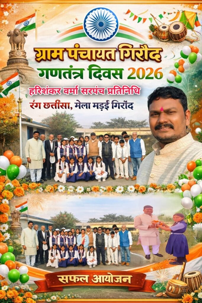 गिरौद (रायपुर)। ग्राम पंचायत गिरौद में 26 जनवरी गणतंत्र दिवस के पावन अवसर पर स्कूली बच्चों द्वारा प्रस्तुत सांस्कृतिक कार्यक्रम, पारंपरिक मेला मड़ई एवं रात्रिकालीन लोक कार्यक्रम ‘रंग छत्तीसा’ का भव्य, सुव्यवस्थित एवं शांतिपूर्ण आयोजन संपन्न हुआ। कार्यक्रम में बड़ी संख्या में ग्रामीणों की उपस्थिति रही और आयोजन ने क्षेत्र में उत्साह एवं सांस्कृतिक चेतना का संचार किया।