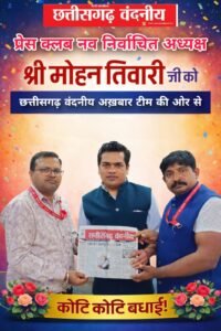 छत्तीसगढ़ वंदनीय अख़बार टीम ने श्री मोहन तिवारी जी के सफल कार्यकाल की कामना करते हुए उन्हें पुनः कोटि-कोटि बधाई दी।