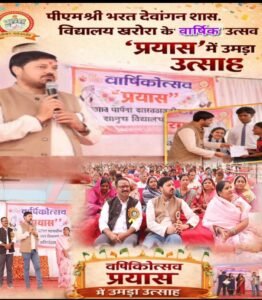 धरसीवां/खरोरा। नगर पंचायत खरोरा स्थित पीएमश्री भरत देवांगन शास. उत्कृष्ट हिन्दी/अंग्रेजी माध्यम विद्यालय खरोरा में आयोजित वार्षिक उत्सव ‘प्रयास’ भव्यता और गरिमा के साथ संपन्न हुआ। कार्यक्रम में अनुज शर्मा मुख्य अतिथि के रूप में उपस्थित रहे। कार्यक्रम का शुभारंभ मां सरस्वती के पूजन एवं दीप प्रज्ज्वलन के साथ हुआ। इस वर्ष की थीम “सांस्कृतिक एकता और आधुनिक शिक्षा” रही।