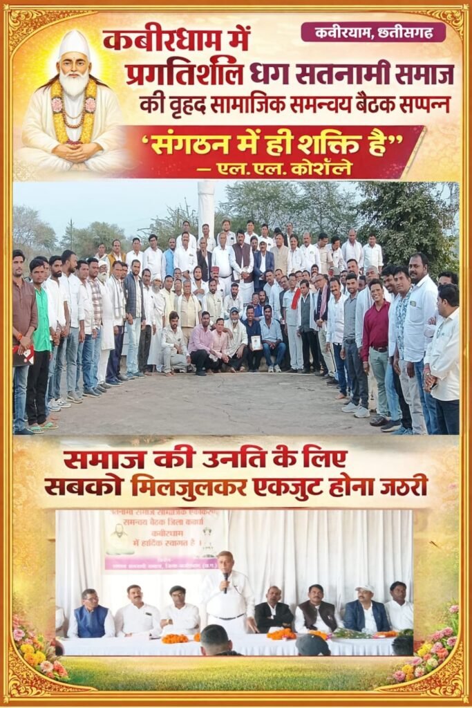 कवर्धा/कबीरधाम। प्रगतिशील छत्तीसगढ़ सतनामी समाज द्वारा पूरे प्रदेश में समाज को एकजुट एवं संगठित करने के उद्देश्य से जिला कबीरधाम में वृहद सामाजिक समन्वय बैठक का आयोजन किया गया। बैठक में चारों ब्लॉक के पदाधिकारी एवं सामाजिक बंधु भारी संख्या (लगभग 200–250) में उपस्थित हुए।