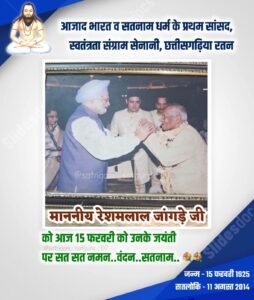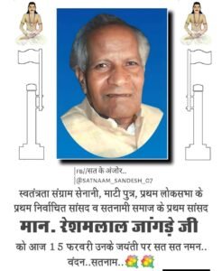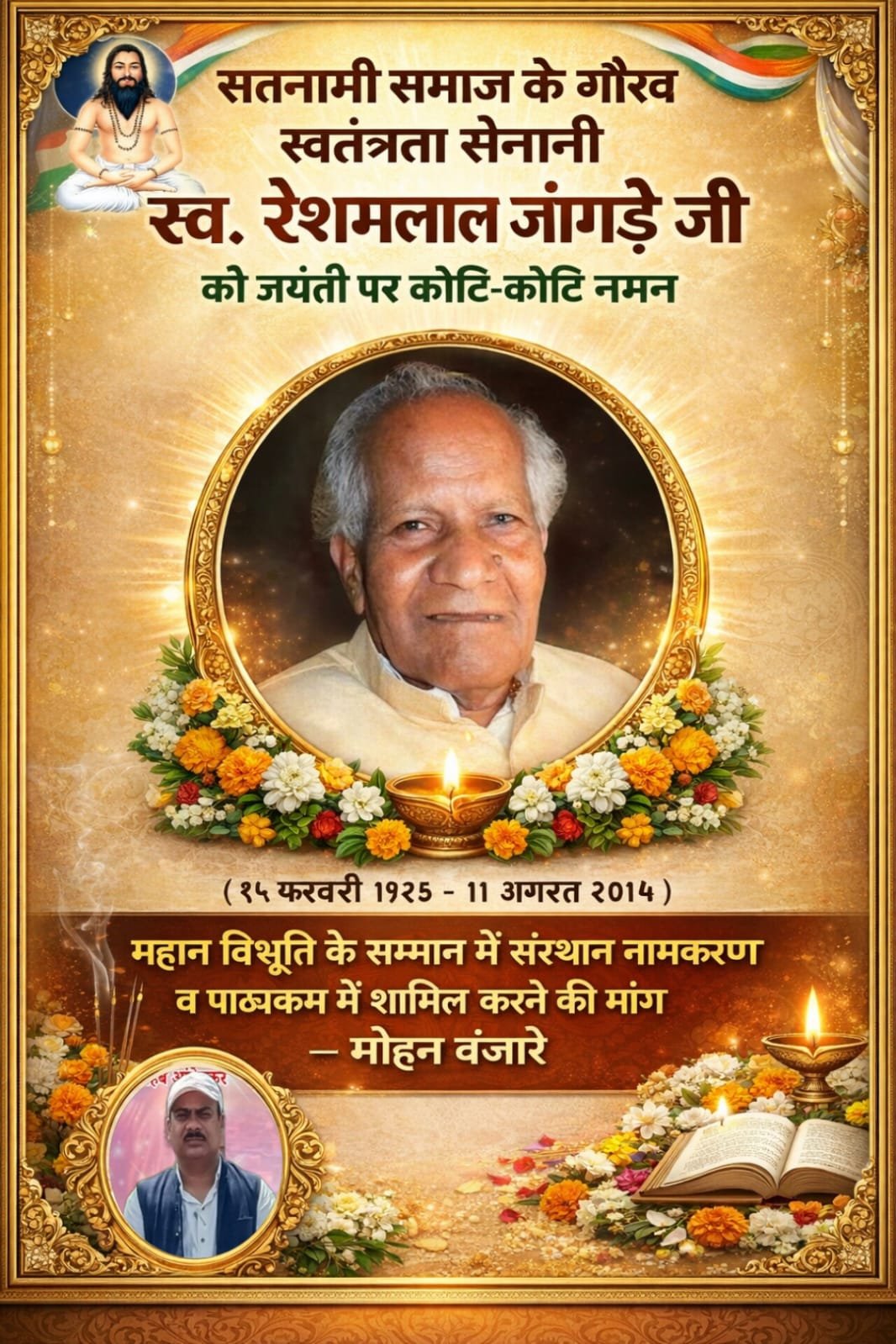 रायपुर। सतनामी समाज के गौरव, स्वतंत्रता सेनानी, समाज सुधारक एवं अविभाजित मध्यप्रदेश-छत्तीसगढ़ से सात बार सांसद रहे श्रद्धेय स्व. रेशमलाल जांगड़े जी की 15 फरवरी जयंती पर प्रदेशभर में श्रद्धांजलि अर्पित की गई। प्रगतिशील छग सतनामी समाज के प्रदेश महासचिव मोहन बंजारे ने उन्हें नमन करते हुए राज्य सरकार से मांग की है कि उनके सम्मान में किसी प्रमुख शासकीय संस्थान का नामकरण किया जाए तथा उनके जीवन संघर्ष को छत्तीसगढ़ के पाठ्यक्रम में शामिल किया जाए।