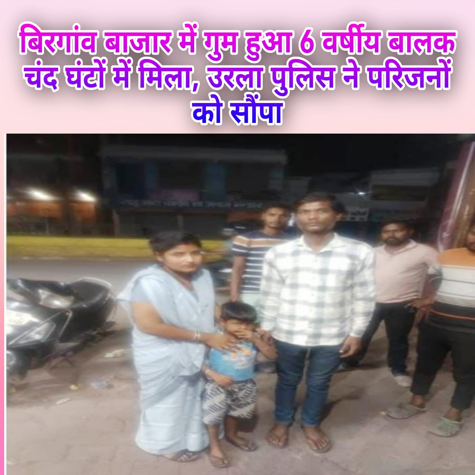 प्राप्त जानकारी के अनुसार 7 मार्च 2026 को थाना उरला क्षेत्र के बिरगांव बाजार में एक 6 वर्षीय बालक अपने परिजनों से बिछड़कर गुम हो गया था। घटना की सूचना मिलते ही थाना उरला पुलिस ने मामले को गंभीरता से लेते हुए तत्काल वरिष्ठ अधिकारियों को अवगत कराया और उनके निर्देश पर बालक की तलाश शुरू की गई।