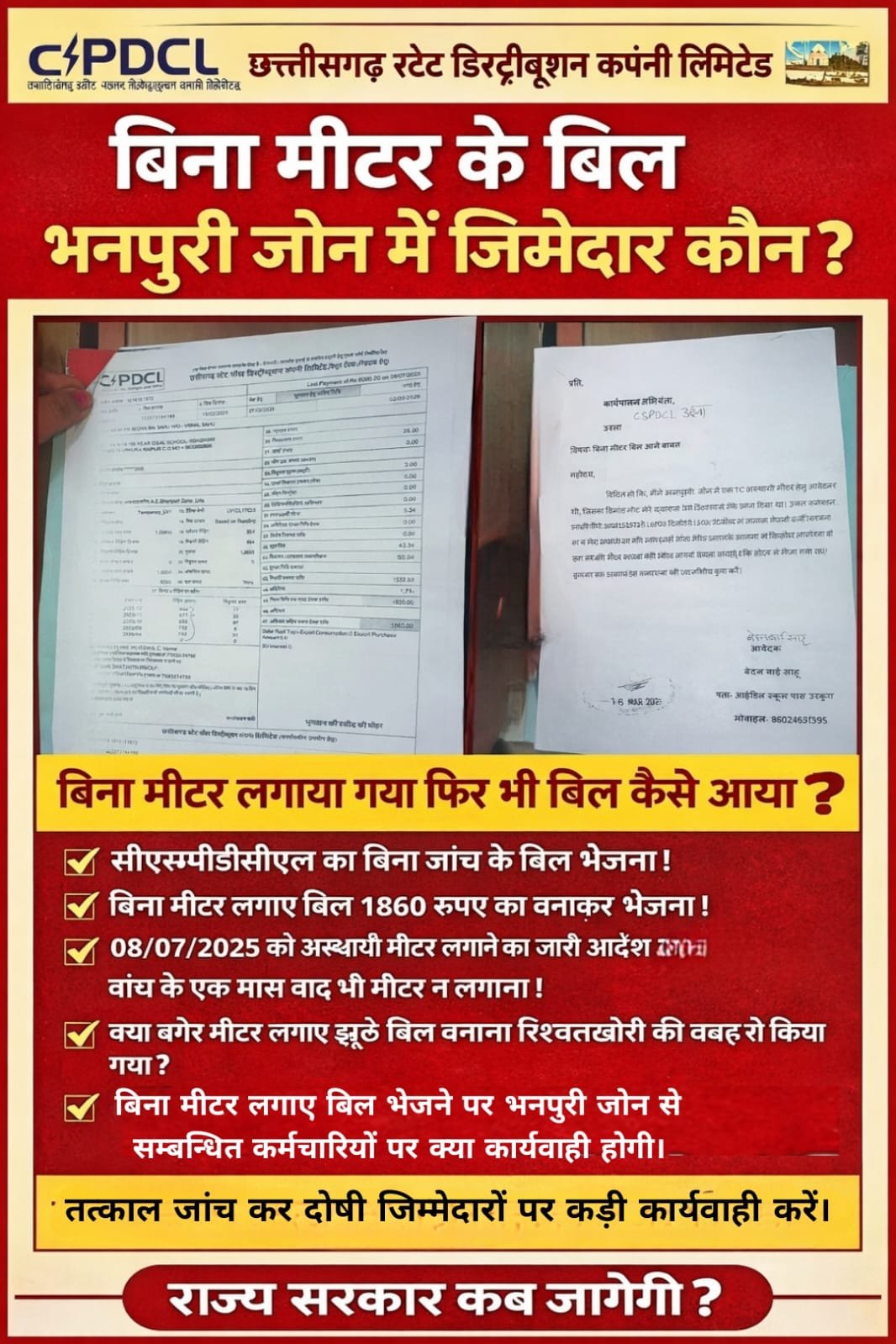 रायपुर। छत्तीसगढ़ स्टेट पावर डिस्ट्रीब्यूशन कंपनी लिमिटेड के भनपुरी जोन से एक चौंकाने वाला मामला सामने आया है, जहां उपभोक्ता को बिना मीटर लगाए ही बिजली बिल थमा दिया गया। इस घटना ने विभागीय कार्यप्रणाली और जिम्मेदार अधिकारियों पर गंभीर सवाल खड़े कर दिए हैं।