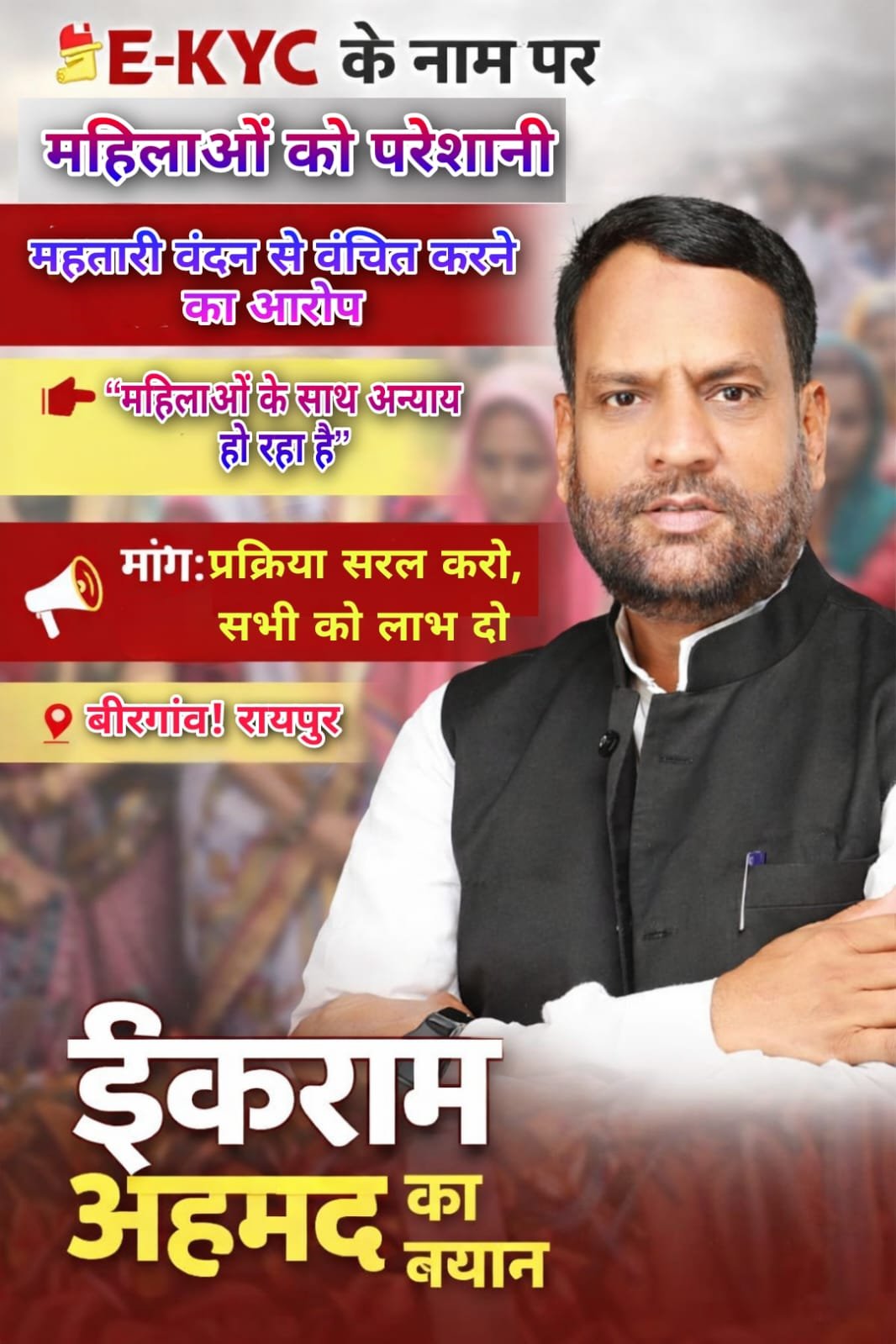 ЁЯУН рд░рд╛рдпрдкреБрд░ | рдЫрддреНрддреАрд╕рдЧрдврд╝ ! рдЫрддреНрддреАрд╕рдЧрдврд╝ рдореЗрдВ рдорд╣рд┐рд▓рд╛рдУрдВ рдХреЗ рд╣рд┐рддреЛрдВ рд╕реЗ рдЬреБрдбрд╝реА рдорд╣рддрд╛рд░реА рд╡рдВрджрди рдпреЛрдЬрдирд╛ рдХреЛ рд▓реЗрдХрд░ рдПрдХ рдЧрдВрднреАрд░ рдорд╛рдорд▓рд╛ рд╕рд╛рдордиреЗ рдЖрдпрд╛ рд╣реИред рдИ-рдХреЗрд╡рд╛рдИрд╕реА (E-KYC) рдкреНрд░рдХреНрд░рд┐рдпрд╛ рдХреЗ рдирд╛рдо рдкрд░ рдмрдбрд╝реА рд╕рдВрдЦреНрдпрд╛ рдореЗрдВ рдорд╣рд┐рд▓рд╛рдУрдВ рдХреЛ рдкрд░реЗрд╢рд╛рди рдХрд┐рдП рдЬрд╛рдиреЗ рдХреА рд╢рд┐рдХрд╛рдпрддреЗрдВ рдорд┐рд▓ рд░рд╣реА рд╣реИрдВред