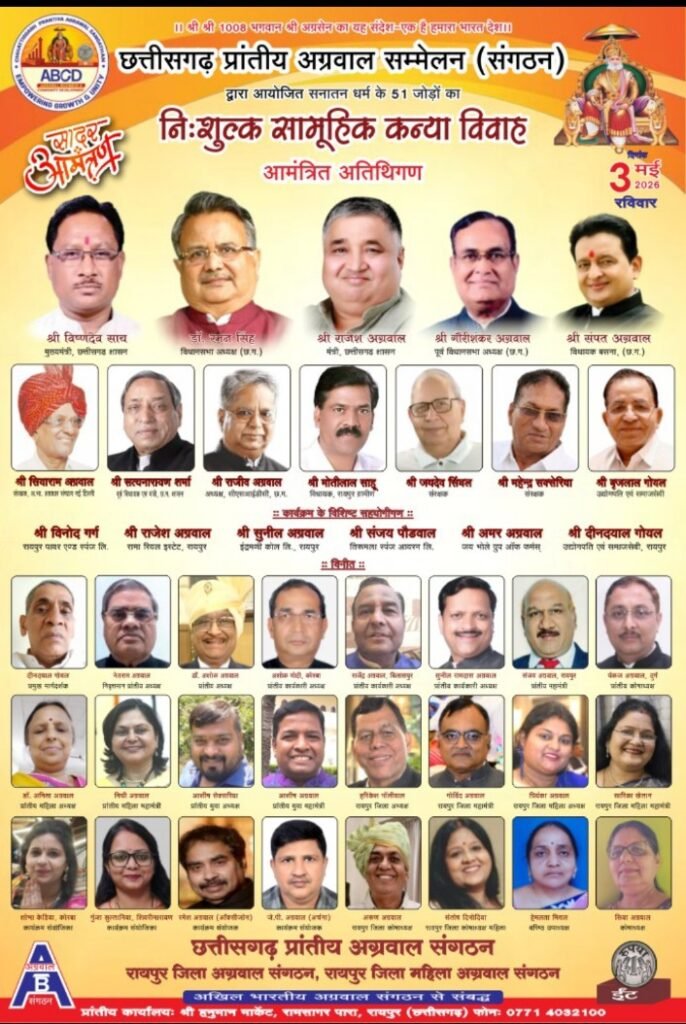 рд░рд╛рдпрдкреБрд░ | 21 рдЕрдкреНрд░реИрд▓ 2026 | рдЫрддреНрддреАрд╕рдЧрдврд╝ рдкреНрд░рд╛рдВрддреАрдп рдЕрдЧреНрд░рд╡рд╛рд▓ рд╕рдВрдЧрдарди рджреНрд╡рд╛рд░рд╛ рдЖрдЧрд╛рдореА 03 рдордИ 2026 (рд░рд╡рд┐рд╡рд╛рд░) рдХреЛ рд░рд╛рдпрдкреБрд░ рд╕реНрдерд┐рдд рд╡рд╛рд▓реНрдореАрдХрд┐ рд╣реЙрд▓, рд╢реНрд░реА рд░рд╛рдо рдордВрджрд┐рд░ (рд╡реАрдЖрдИрдкреА рдЪреМрдХ) рдореЗрдВ рдирд┐рдГрд╢реБрд▓реНрдХ рд╕рд╛рдореВрд╣рд┐рдХ рдХрдиреНрдпрд╛ рд╡рд┐рд╡рд╛рд╣ рд╕рдорд╛рд░реЛрд╣ рдХрд╛ рднрд╡реНрдп рдЖрдпреЛрдЬрди рдХрд┐рдпрд╛ рдЬрд╛ рд░рд╣рд╛ рд╣реИред рдпрд╣ рдЬрд╛рдирдХрд╛рд░реА рд╕рдВрдЧрдарди рджреНрд╡рд╛рд░рд╛ рдЖрдпреЛрдЬрд┐рдд рдкреНрд░реЗрд╕ рдХреЙрдиреНрдлреНрд░реЗрдВрд╕ рдореЗрдВ рджреА рдЧрдИред